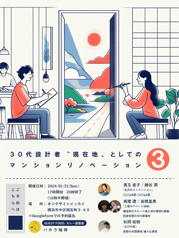 1/21(日)オンデザインイッカイにて、創造系不動産主催によるトークイベント『30代設計者“現在地”としてのマンションリノベーションvol.3』が開催されます。