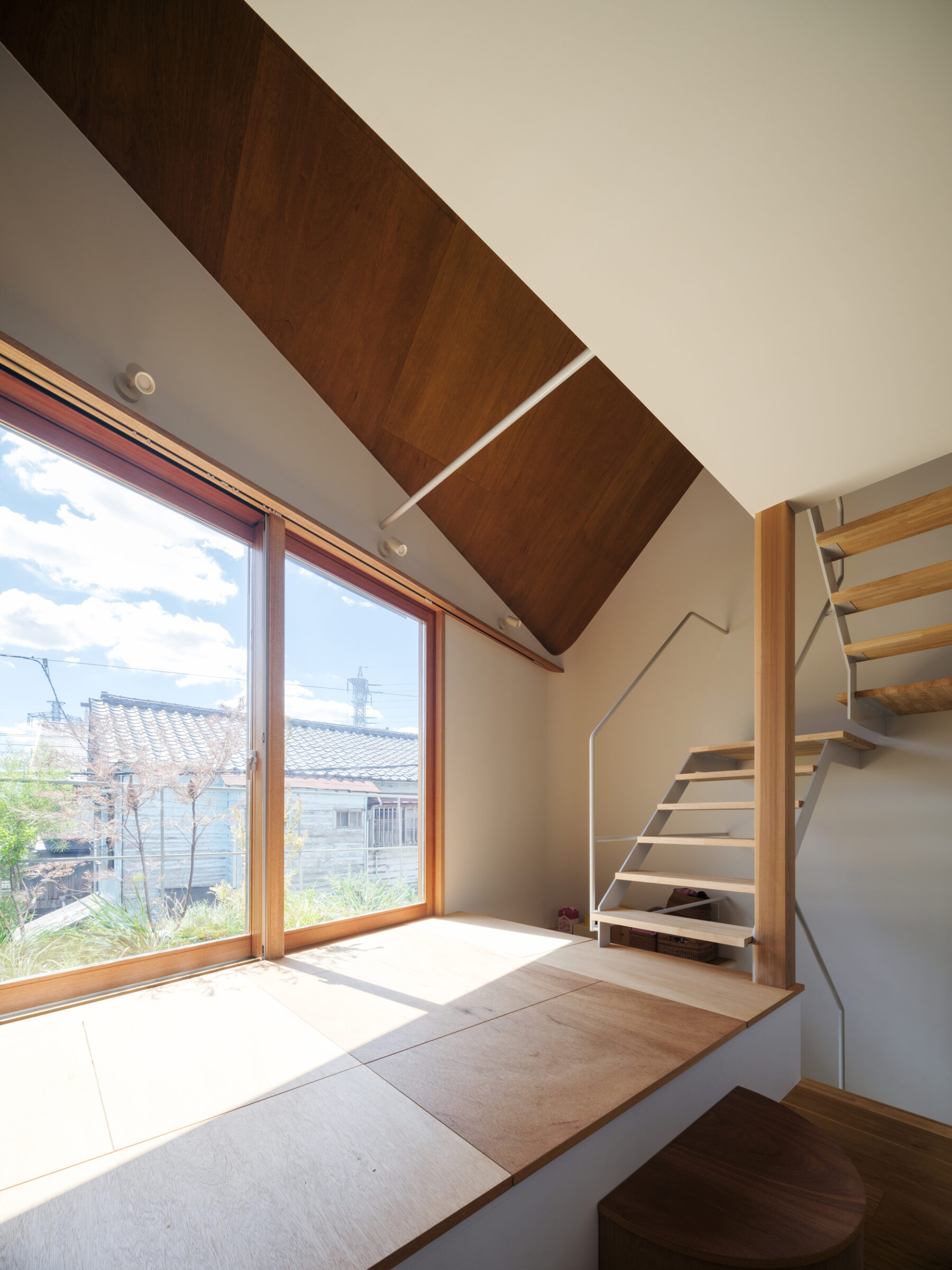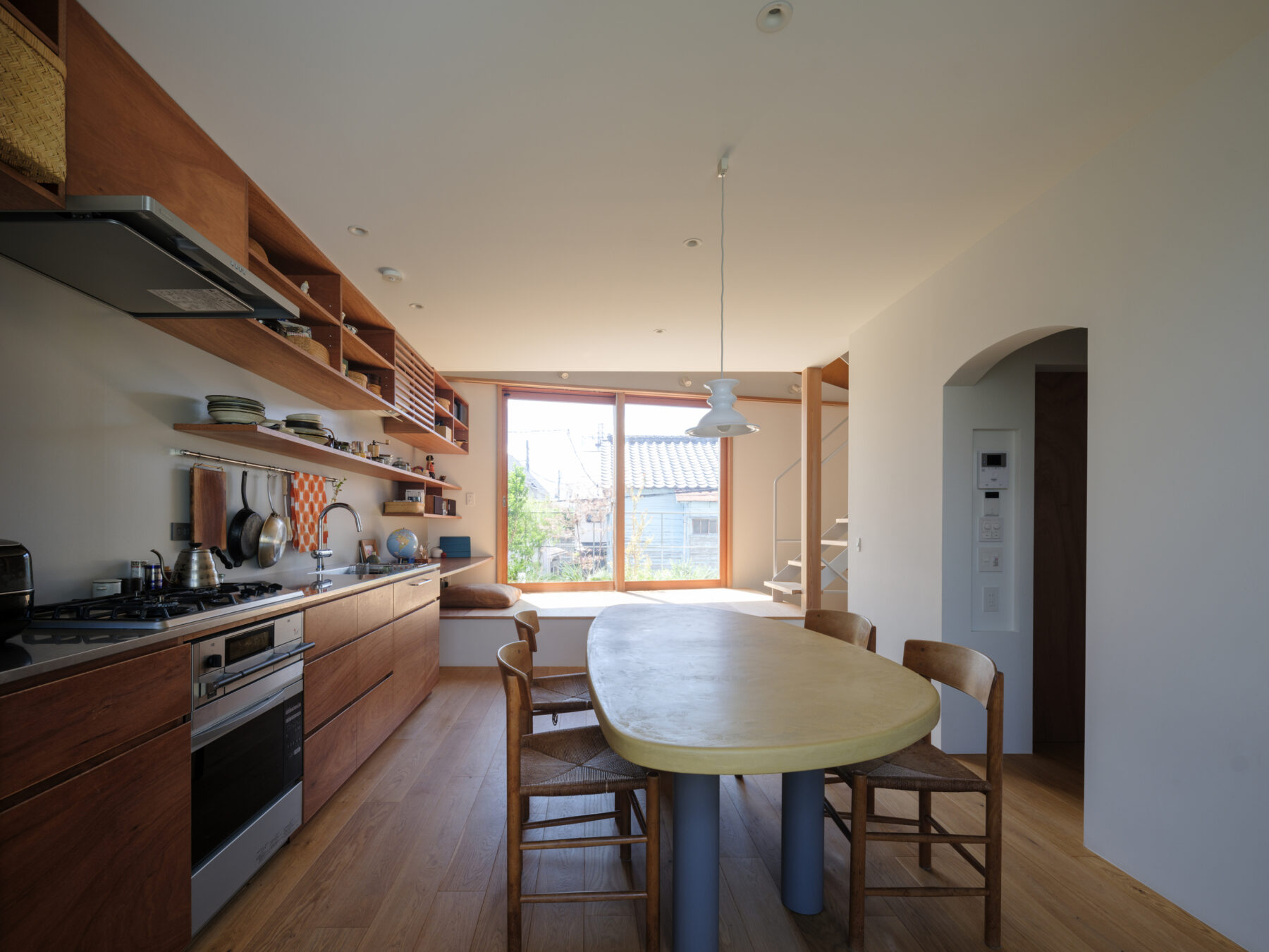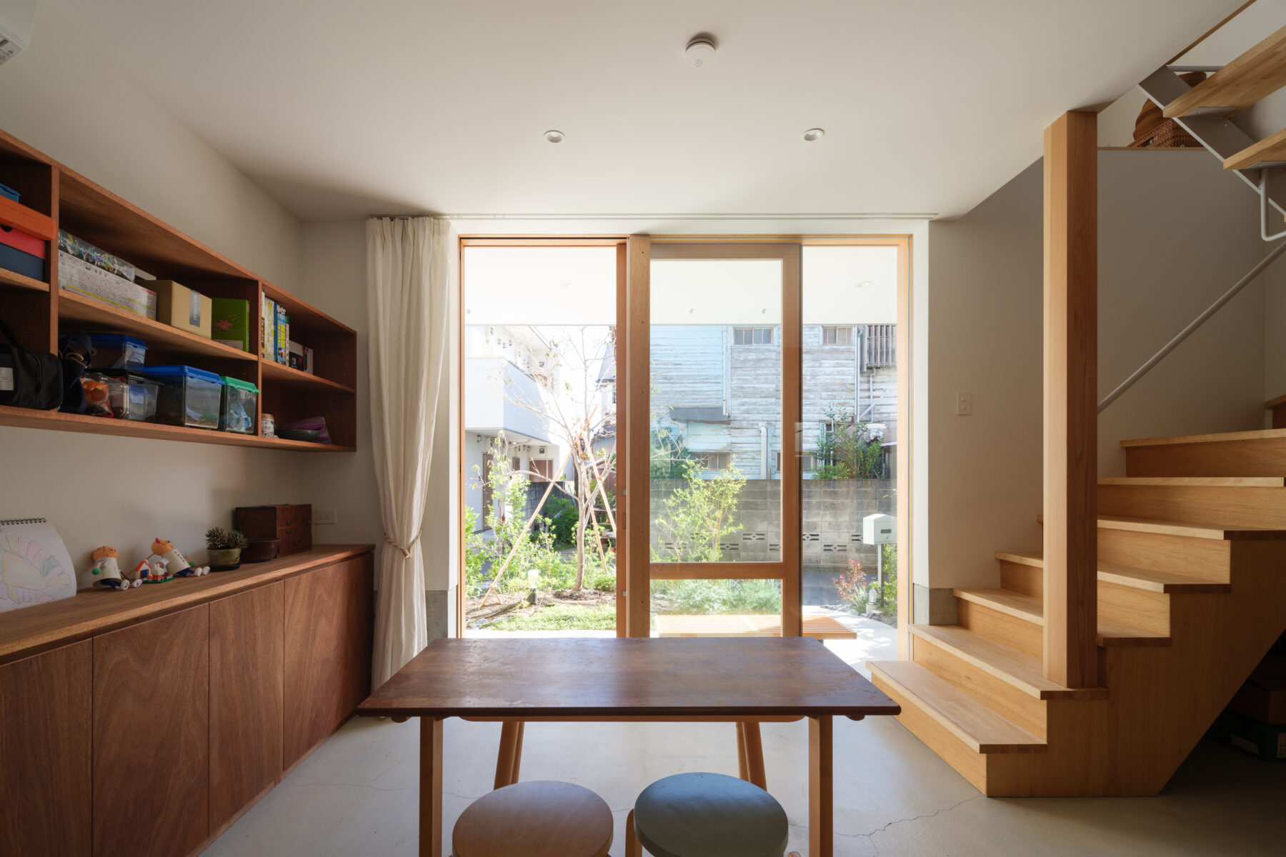 主な生活スペースを2階以上とし、1階は仕事場と工作や接客スペースとして使える土間空間として、庭にひらいています。仕事場には日中路地を見守る大人がいて、子どもたちは路地が広がったような庭で遊ぶ、安心して暮らせる環境をつくります。2階の生活スペースはテラスや出窓を介して庭と繋がり、街とほどよい距離感で落ち着いて暮らせる設えの工夫をしています。アクティブな建て主の暮らし方に合わせ、大きなテーブルのある広いダイニングキッチンに対して、リビングは小さな居場所を家じゅうにちりばめ、家族それぞれが様々な場所で過ごせる住宅としました。