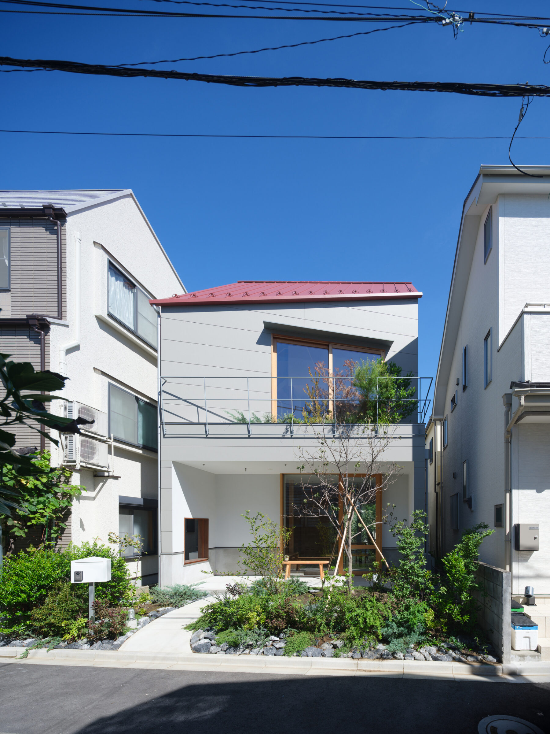 敷地は東京都心に隣接した様々なカルチャーが交錯するエリアで、住民のみが通る路地のインフラを維持する組合をつくり、コミュニティを大切にしている地域です。高齢化により空家や単身者向けアパートが増え、街は雑然とし日中は人が少なく路地は閑散としていました。敷地は南北2面で路地に面しており、フットプリントを小さくした3階建てとして南北にそれぞれ庭を配置し2つの道に開く住宅としました。