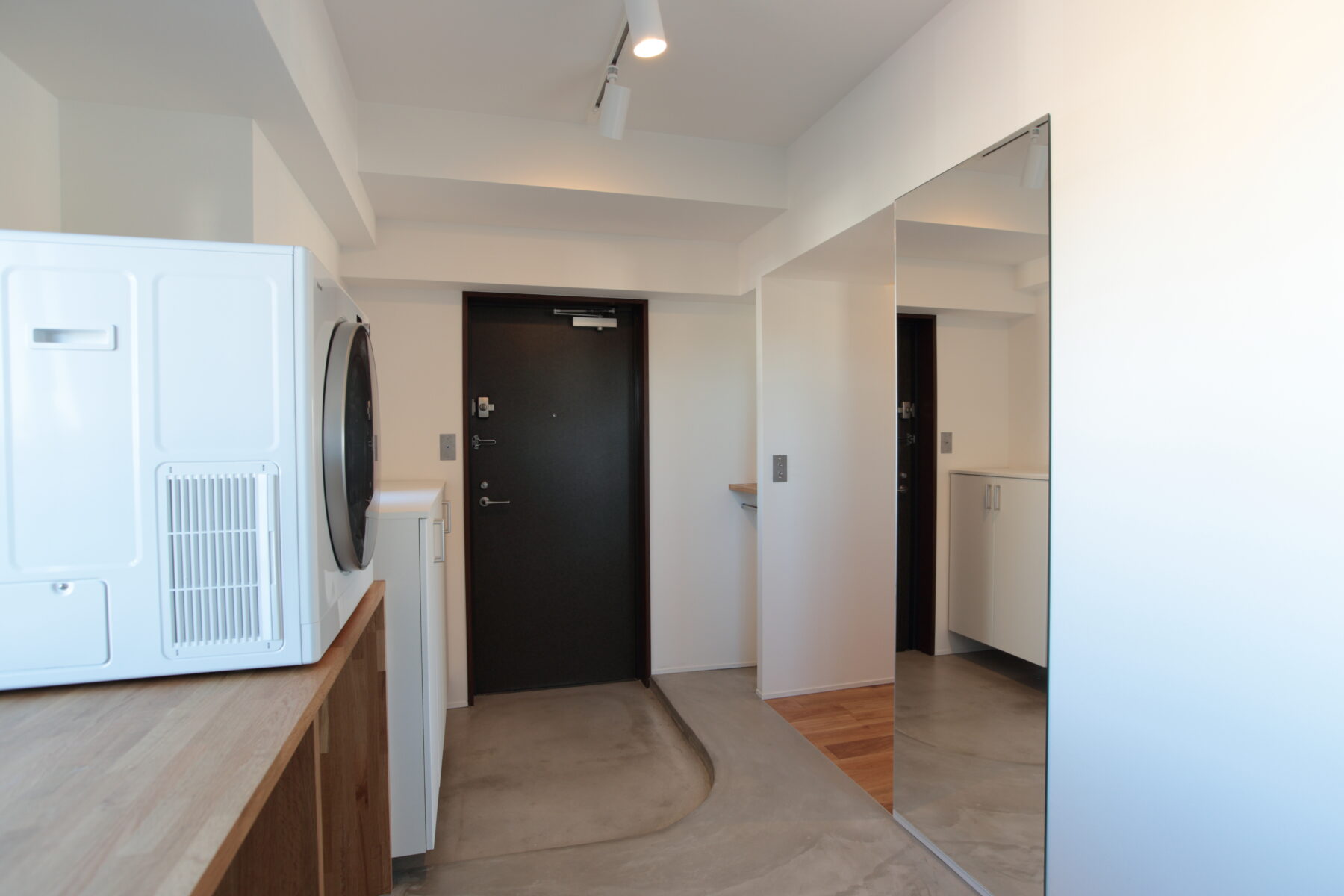 その他のスペースは建て主の希望予算に合わせて、部分的なリノベーションが施されています。玄関部分は、広々とした土間部分に、ストレージ、洗濯物干し、家事スペースが確保されており、使い方によってはちょっとしたワークスペースにもなります。窓付近に排気用ダクトを確保することで、ご夫婦の強い要望でもあったガス衣類乾燥機も備えることができ、家事のための動線がまとめられています。