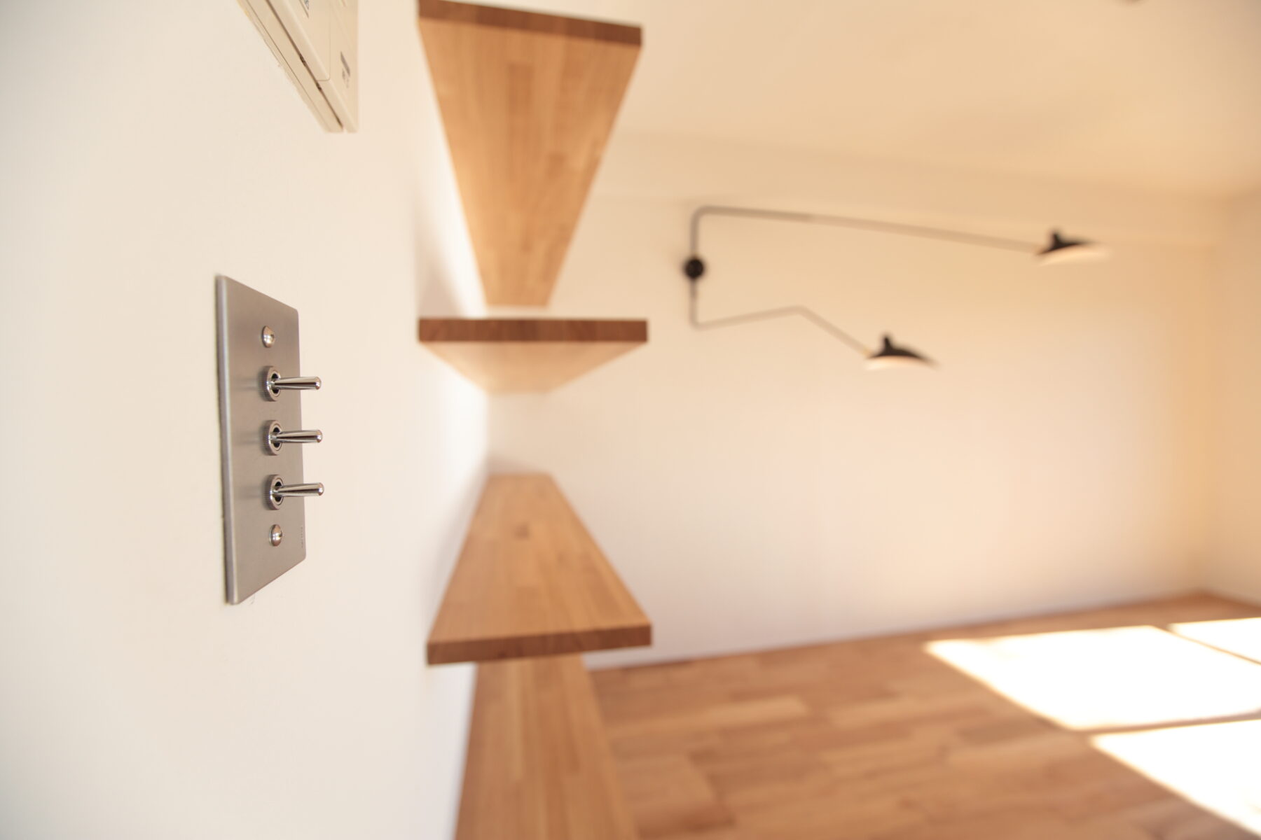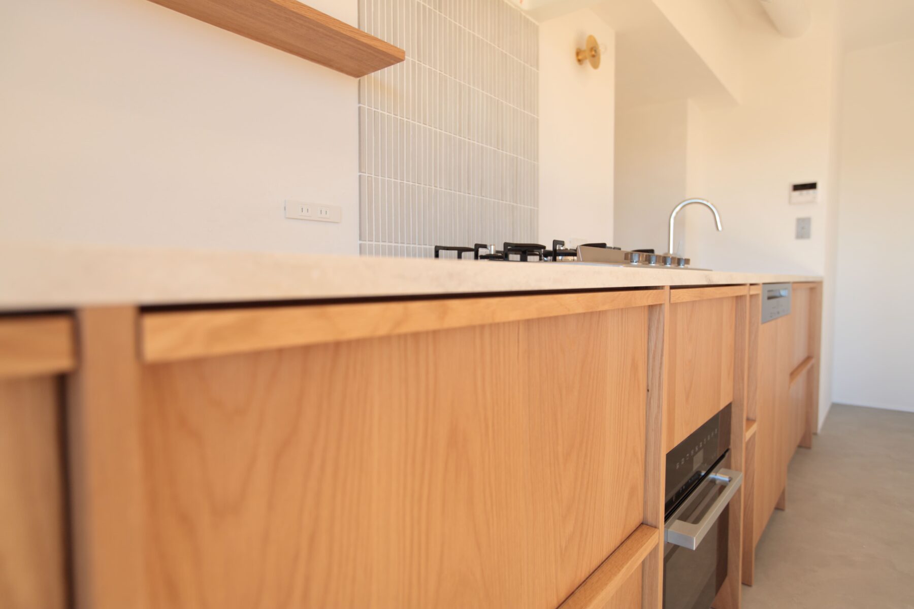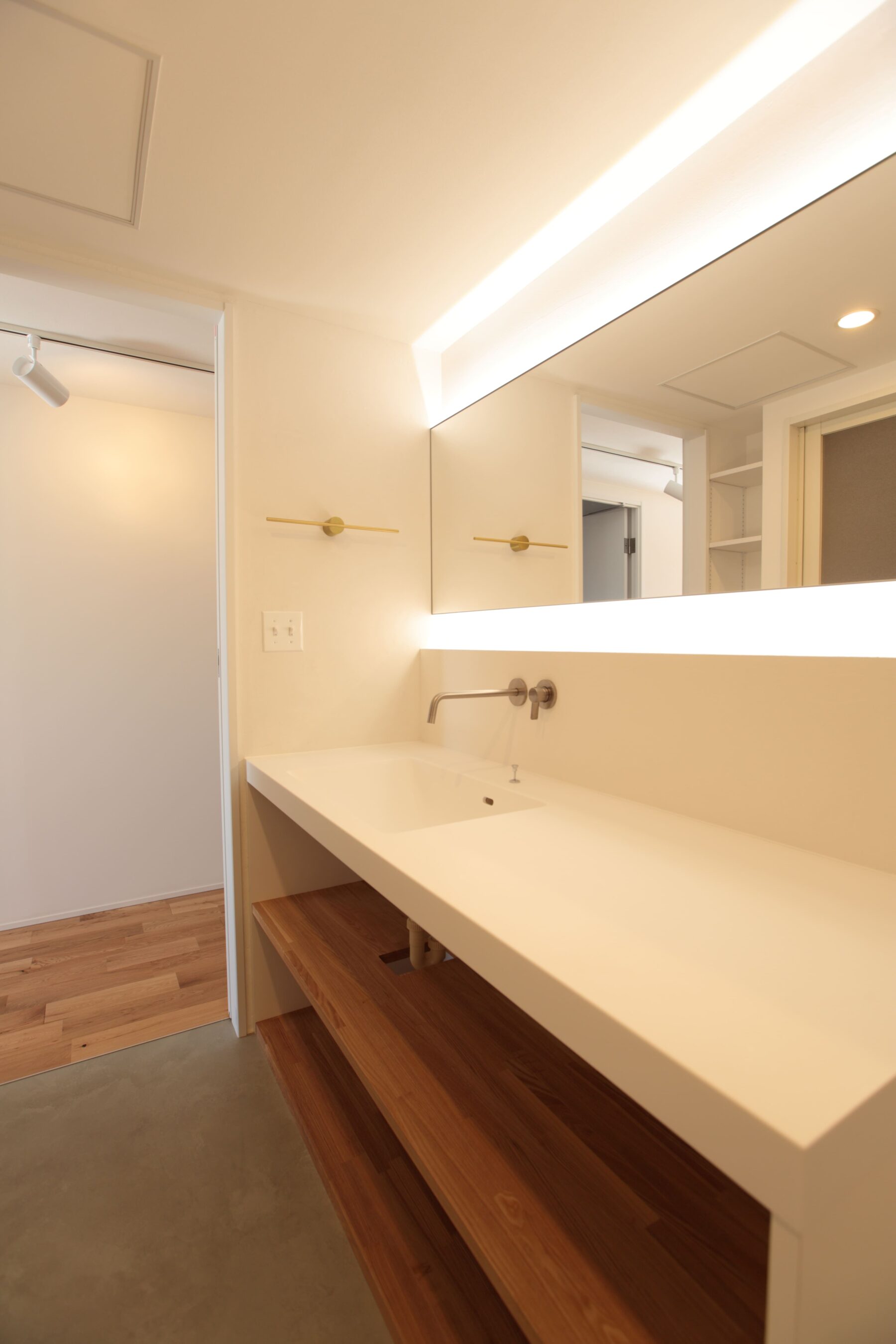 もともと水回りは、天井高が低く、特に床は躯体に直接の仕上だったため、配管スペースがありませんでした。そこで、見えない部分に隠し壁を作り、配線・配管ルートが表に出ないよう工夫されています。それにより、凸凹が出ないスッキリとした印象に仕上がっています。