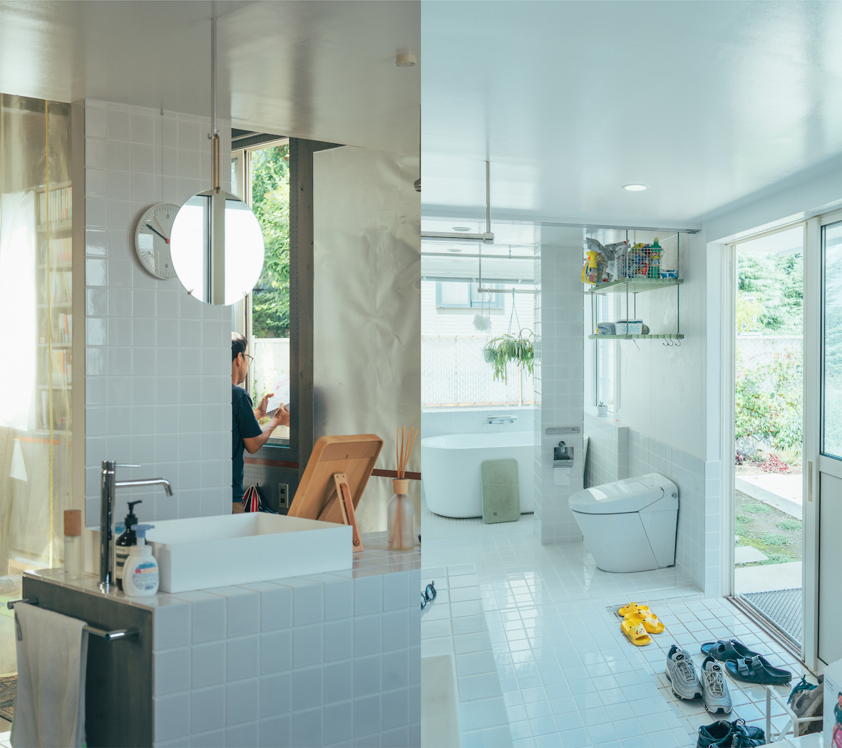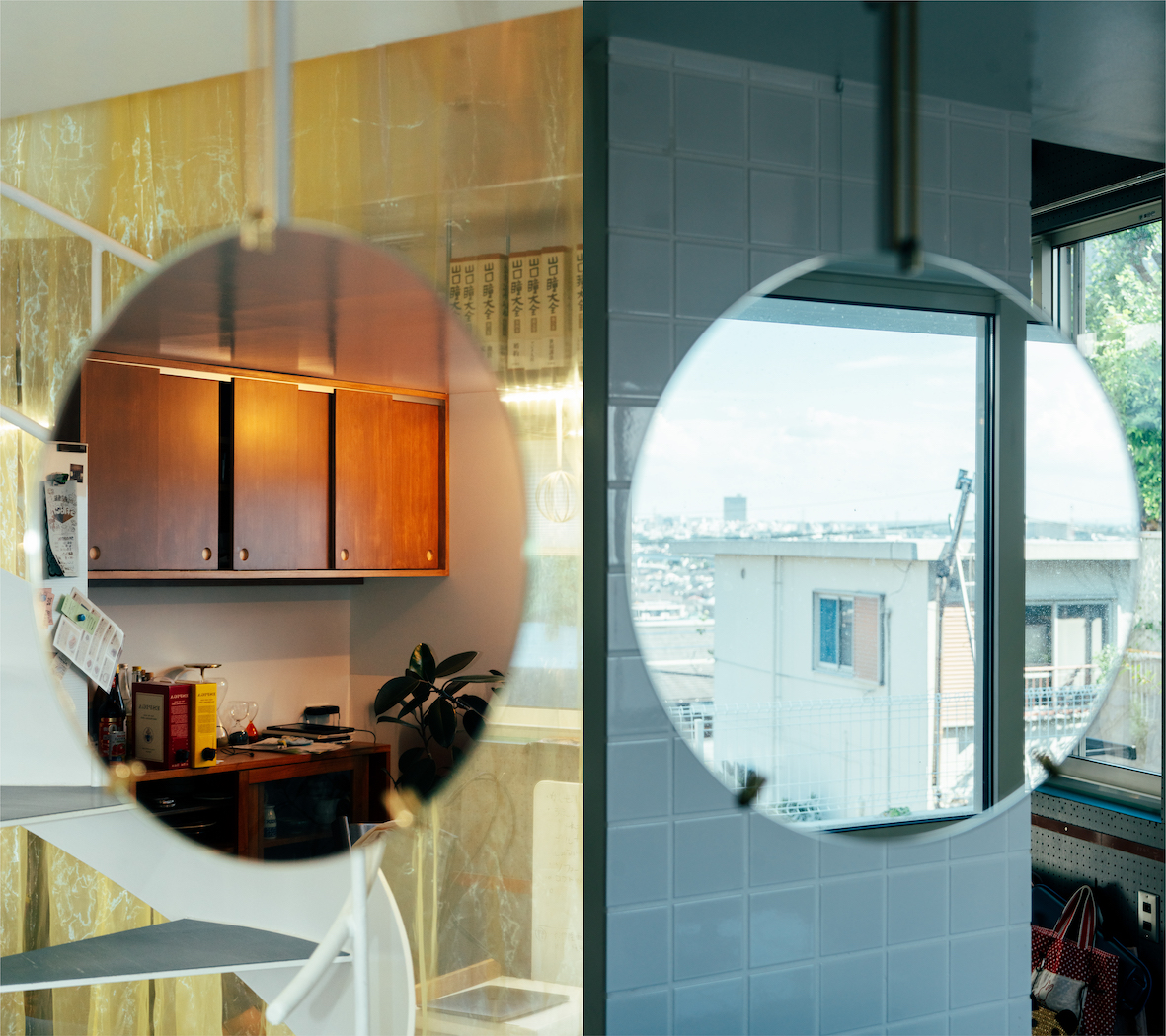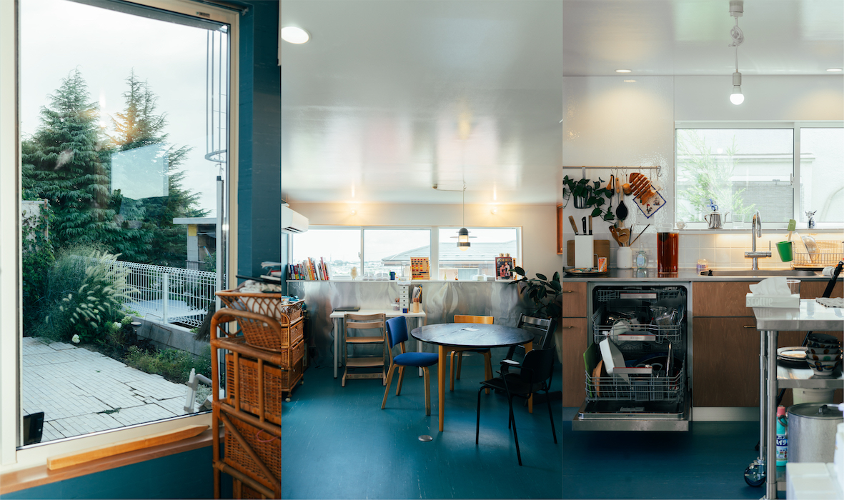この家では、ばらばらの世界が一処に存在する。ただし、大きな続き間に各要素が混在するのではなく、用途や趣向によって設えられた各室が、混ざることなく隣り合っている。丁寧に使い込まれた食器が棚板に並ぶキッチンを舞台に、父親はコーヒーを注ぐ。それを横目に、白色タイルが煌めくバスルームでは子供が鼻歌を歌いながら鏡を覗き込む。書棚とワークテーブルが伸びる細長い書斎では母親が締め切り前の作業に追われ、北側の街並みに大きく開かれたテラスではもう一人の子供が友達と遊んでいる。それらは互いを区切る壁がないままに、不完全なアウトラインを保ちながら、パラレルに存在する。まるで書割でつくられた舞台セットのように、閉じ切らない場が向かい合い、その間に微かなずれを伴って一つの家をつくる。ばらばらの世界が同時に動いているということ。そのようなリアルを感じながら、世界と世界の間をワープするように行き来する。そんな生活に可能性を感じている。