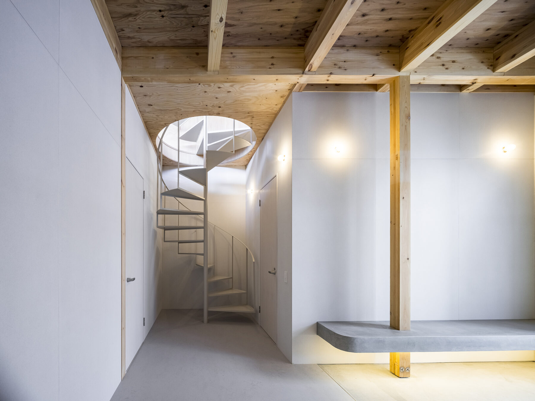 コンクリートの上に家型の木造が載りずれることで、1階に屋根付き駐車場、2階に南面するテラスが生まれました。このダイナミックな構成は、敷地条件や間取り、構造的な合理性を突き詰める中で、必然的に生まれました。また、落ち着きの感じられる静かで機能性の高い1階の個室に対して、明るく開放的で大きな窓に囲まれた温かみのある木の大屋根に包まれた2階という対照的な空間の特徴も、この住宅の中に様々な居場所を作り出しています。(高塚章夫)