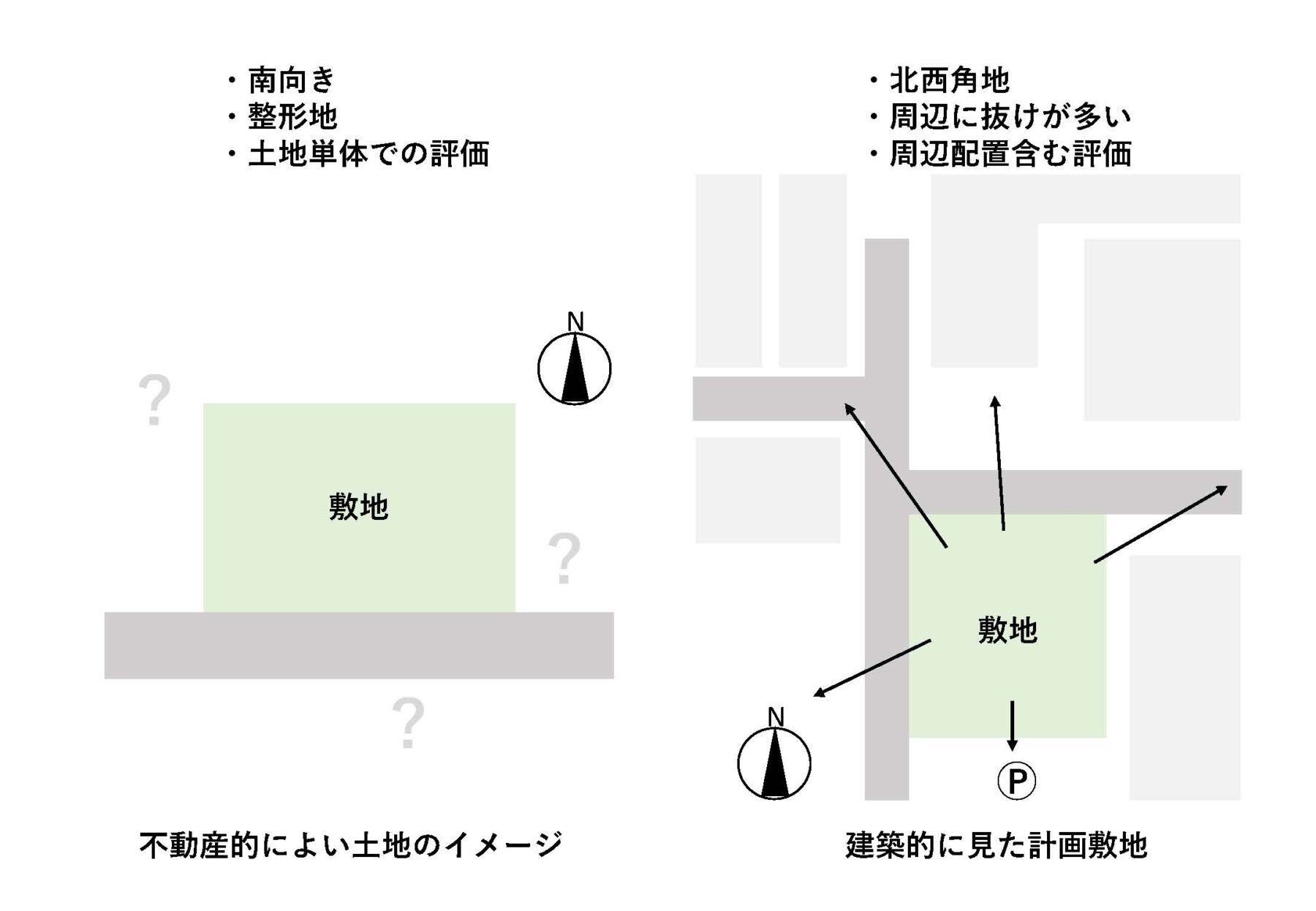 クライアントが細かい空間のイメージを描けていない段階で土地を探す際は、この感覚が重要になります。それには建築と不動産のあいだの視点で敷地を読み取ることが必要です。