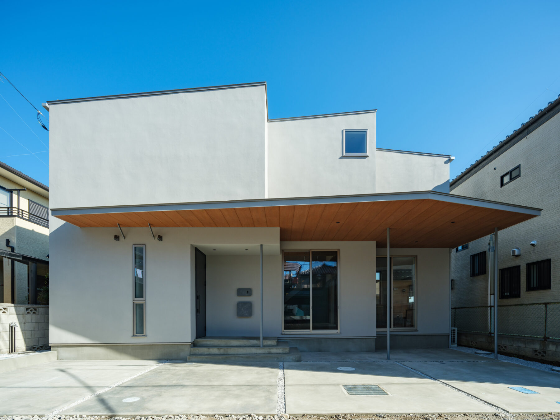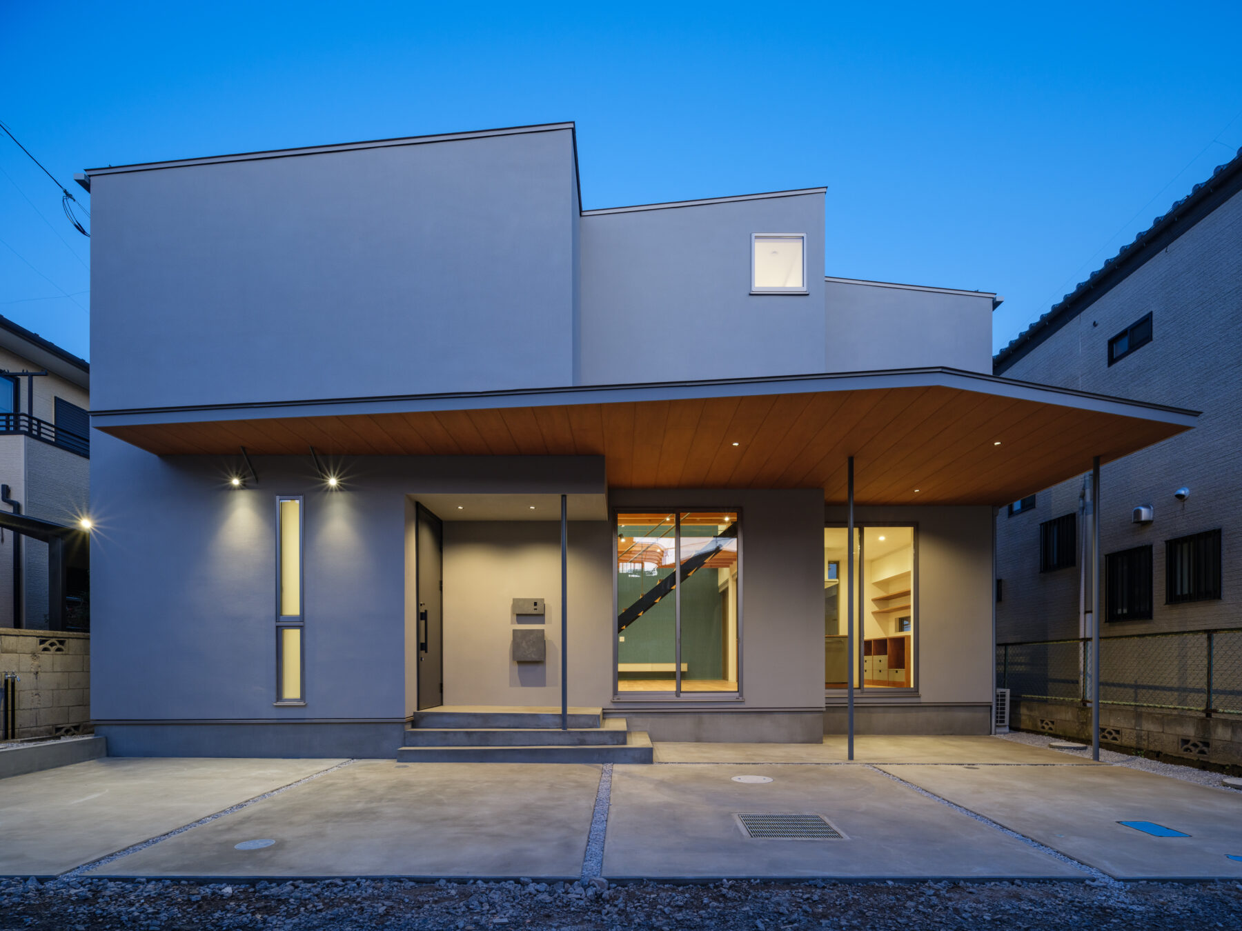 完成した家は、北側の玄関前の広い土間スペースには大きな庇が掛かり、二台の車の駐車スペースにもなっています。また、袋小路で人通りが少ないこともあって、家の中と繫がる活動的な外部空間ともなっています。