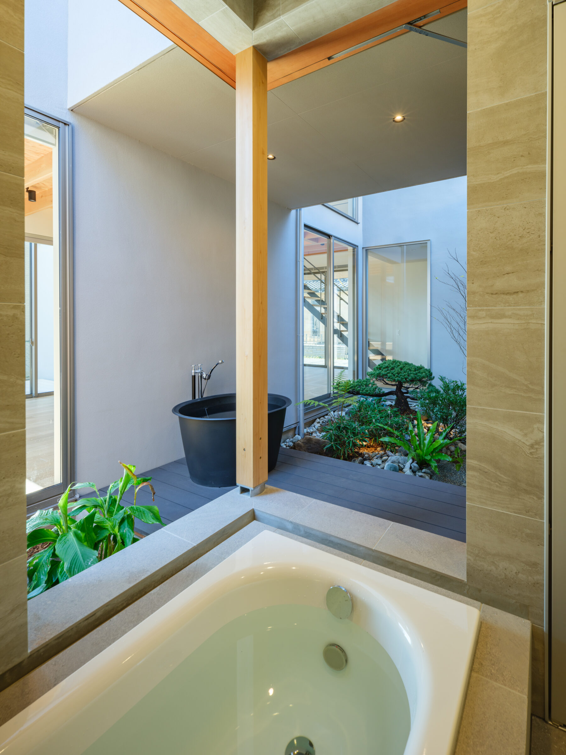 その中庭には露天風呂もあり、大きく開く窓のある内風呂に入った人としゃべりながら入れる場所に置いてあるので、家族やお友達とお風呂に入りながら、ゆったりとバス・コミュニケーションが展開されます。