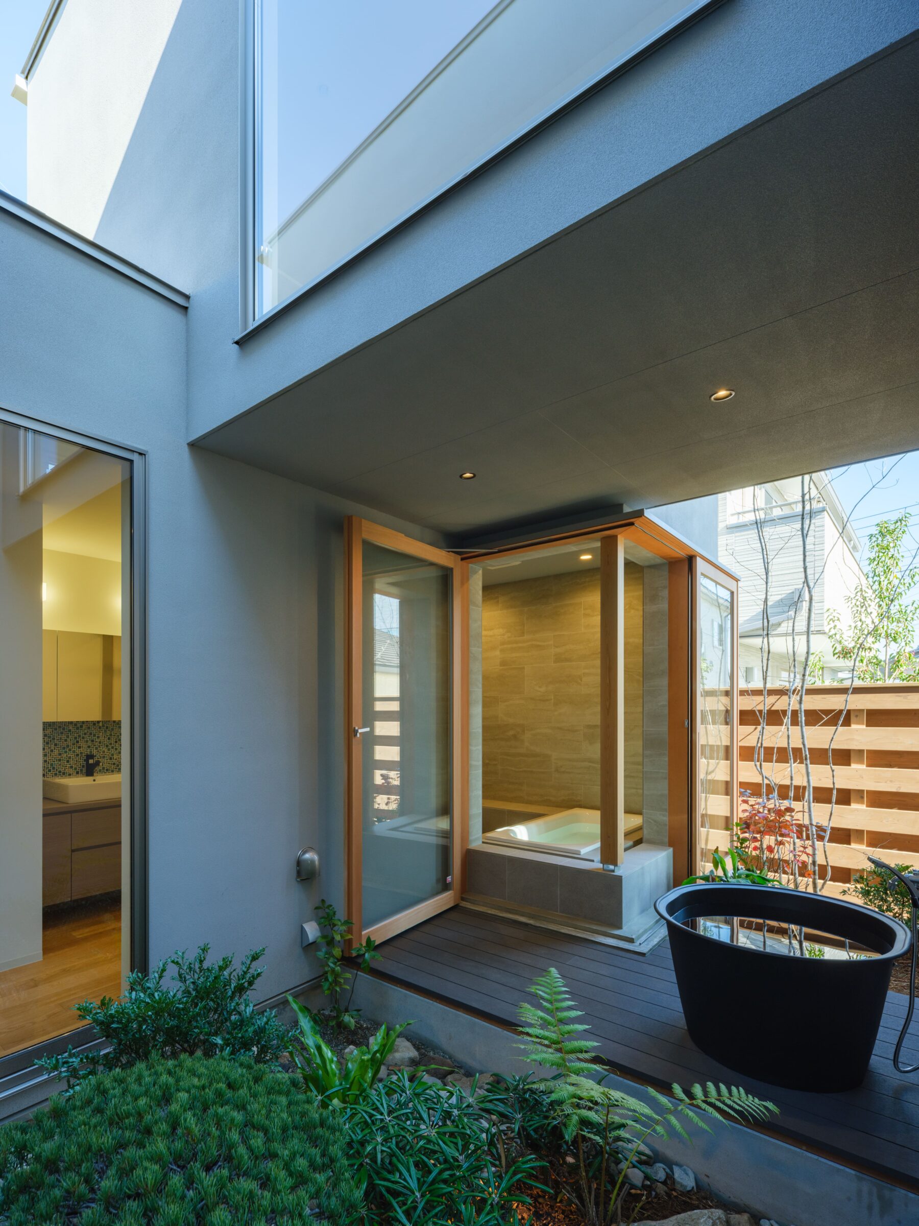 ご夫婦、3人の子供さん、ご友人などが、ここでは皆が家の様々な場所で思い思いに過ごしながらも、中心にある盆栽の坪庭や露天風呂と言う特別なアイテムを感じ、オープンで、楽しく、自由な施主家族そのもののような空間を感じられる家になりました。