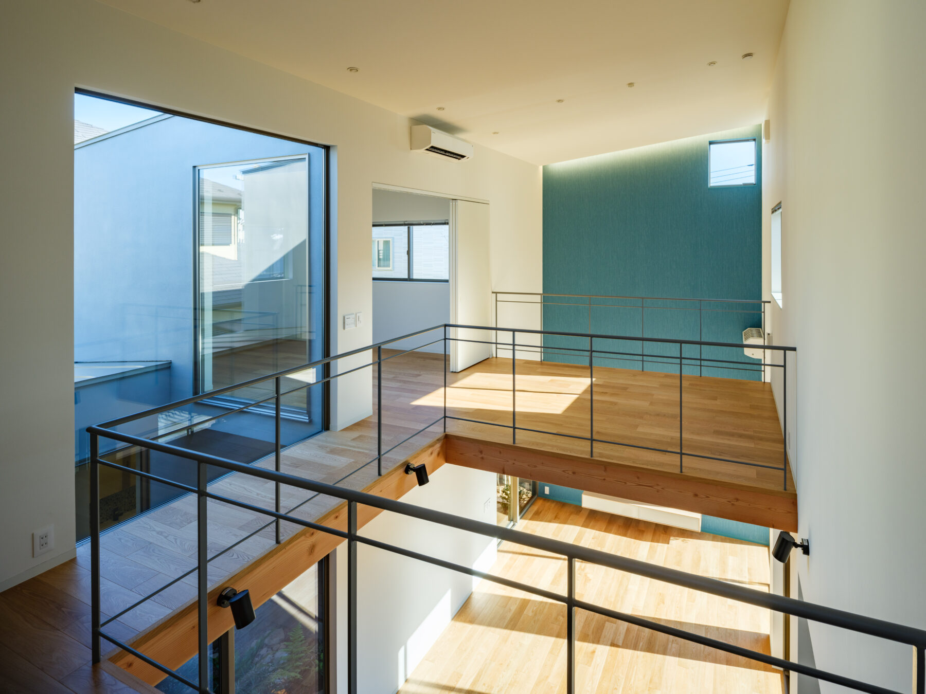 周囲と内部の3つの外部空間がリビングダイニングの2つの吹き抜けと絡み合って、内外の境界を曖昧にしつつもプライバシーを確保した家になっています。