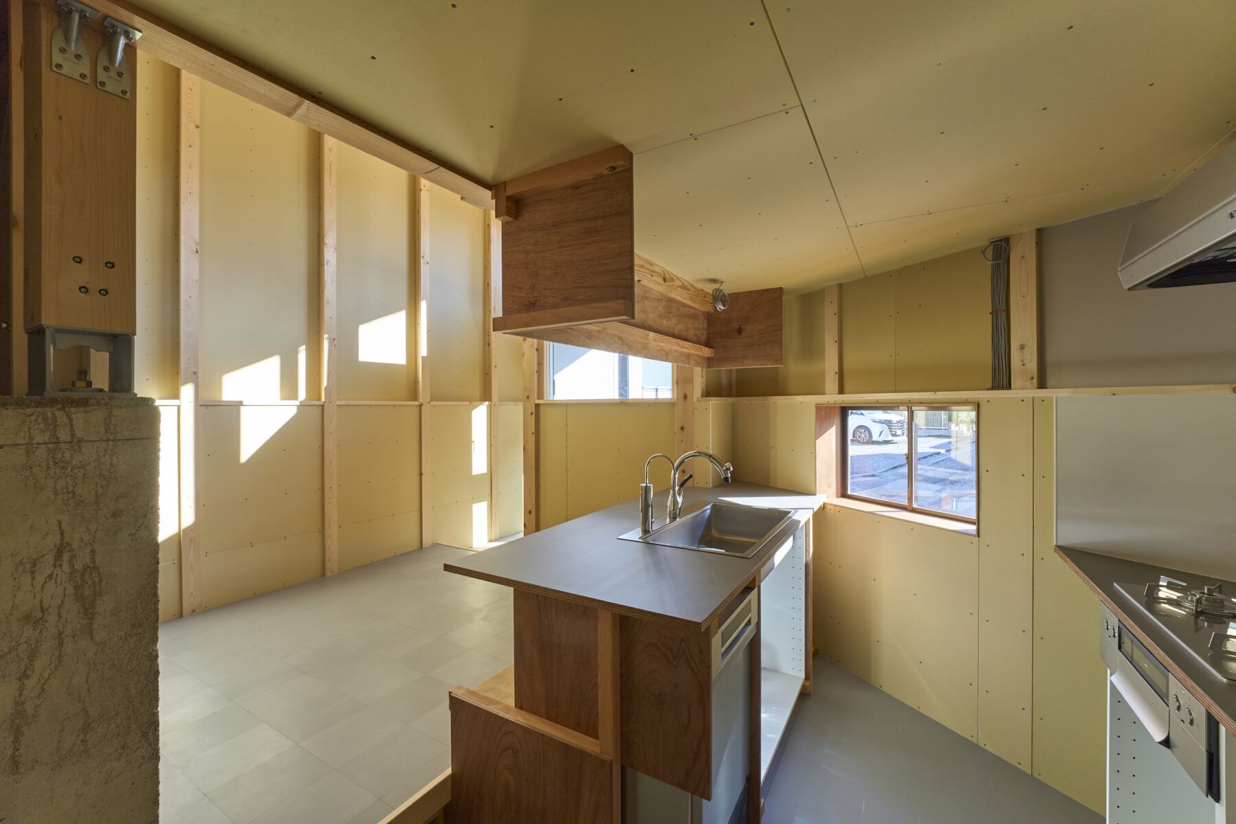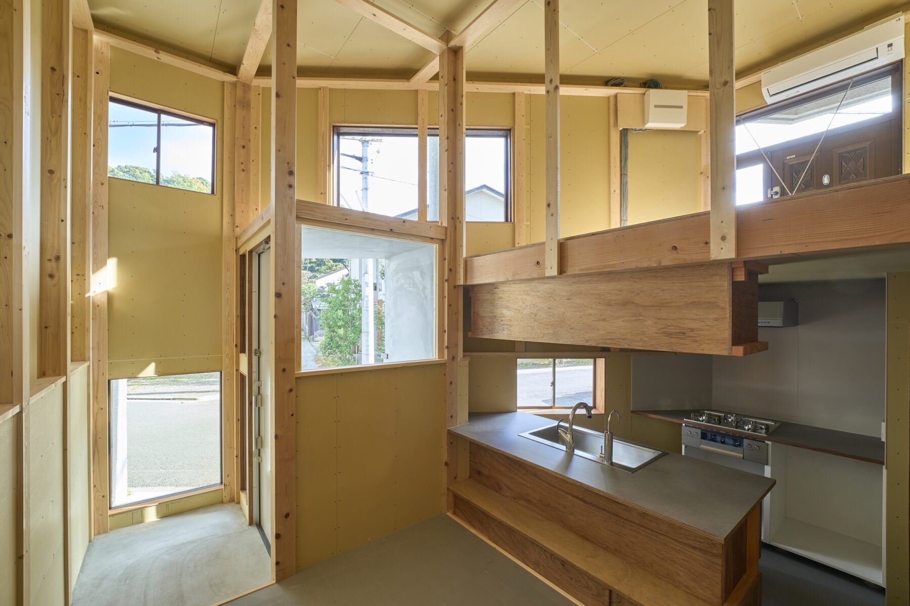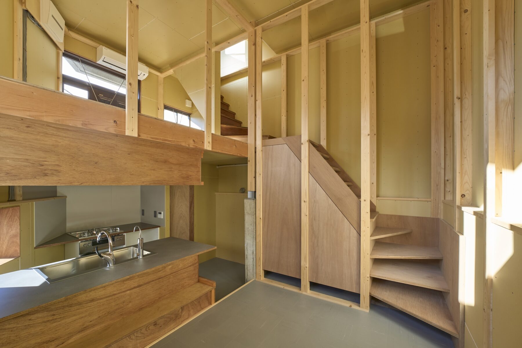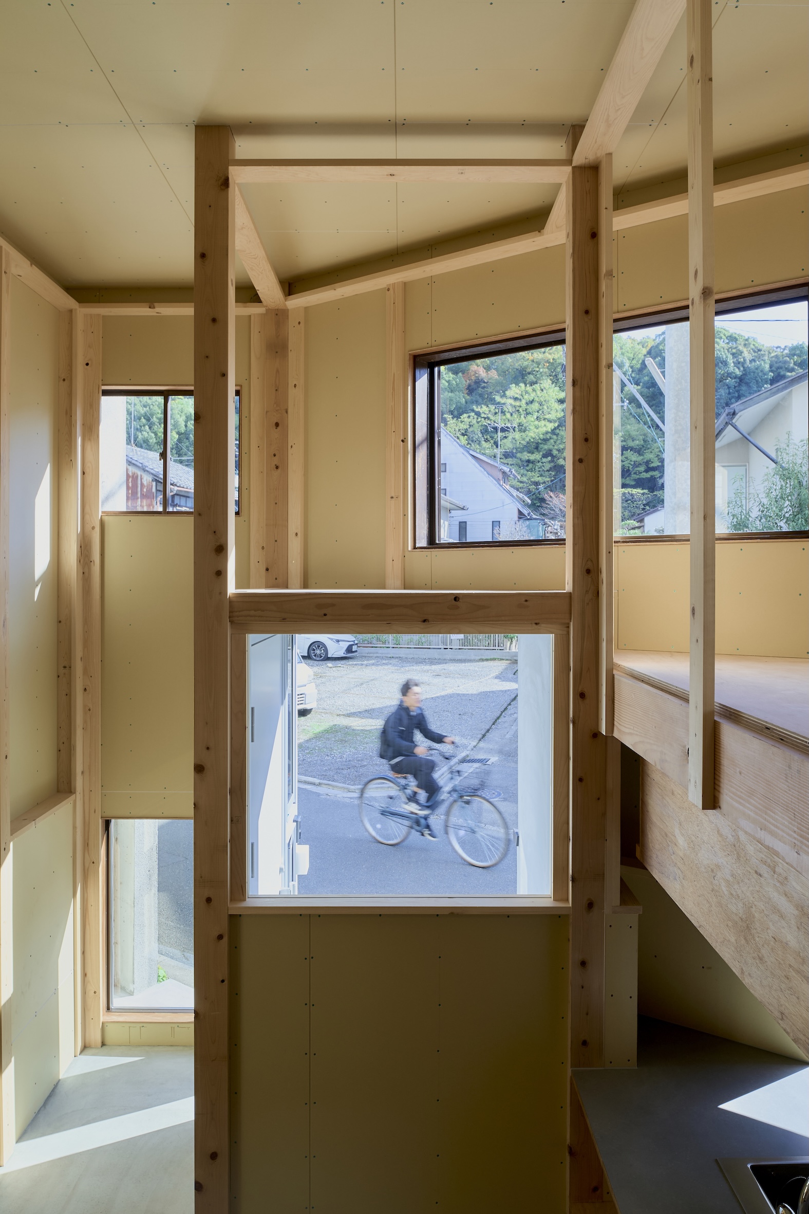 家の中のさまざまな視点からの眺望と自主施工することとしたものが見えかくれし、住み手にとって意味の奥行きを生む設計となっています。〈安田渓〉