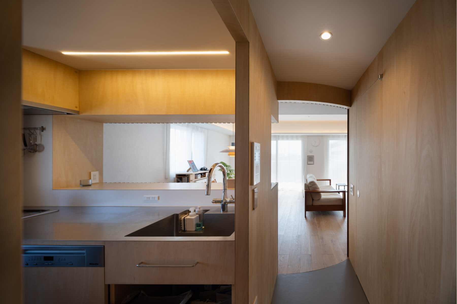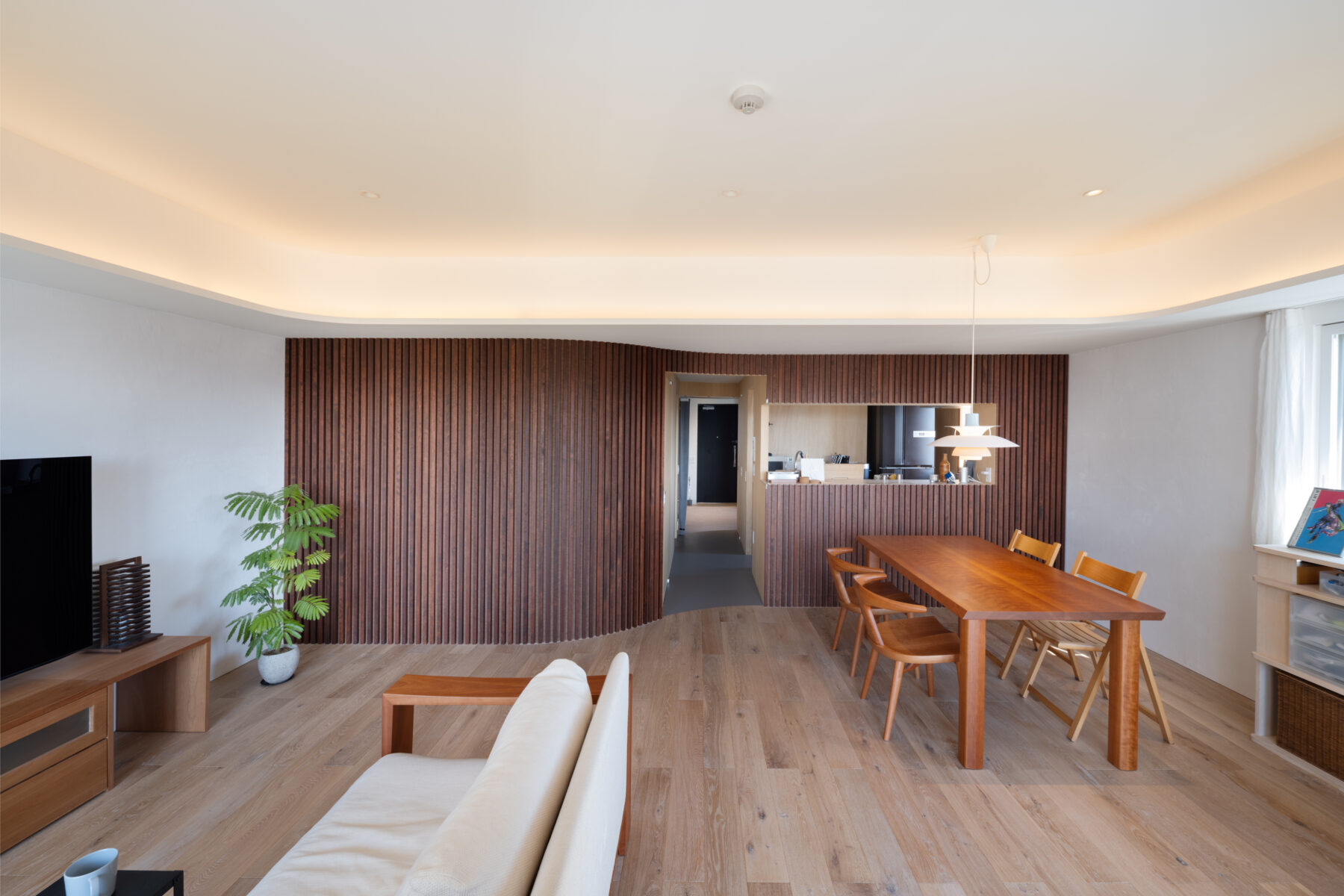 もとの3LDKを2LDKに改め、水まわりは住戸中央にあるものの、廊下を境に左右がわずかにずれており、このズレを柔らかくつなぐように、コントラバスを思わせる曲面の木のルーバー壁を挿入した。この壁は、玄関・寝室・オープンスペース、水まわり、リビングダイニングという3つの空間を緩やかにつなぎ、演奏時には吸音の役割も果たしている。