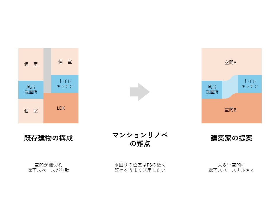 マンション探しでは、専有面積や駅からの距離、築年数といった数値的な条件が重視されがちです。しかし、パイプスペースの位置のように見えにくい要素が、リノベーションで大きな影響を持つことも少なくありません。建築家の視点が加わることで、そうした見えにくい制約がむしろポテンシャルへと転換され、その不動産にしかない魅力が引き出されていきます。