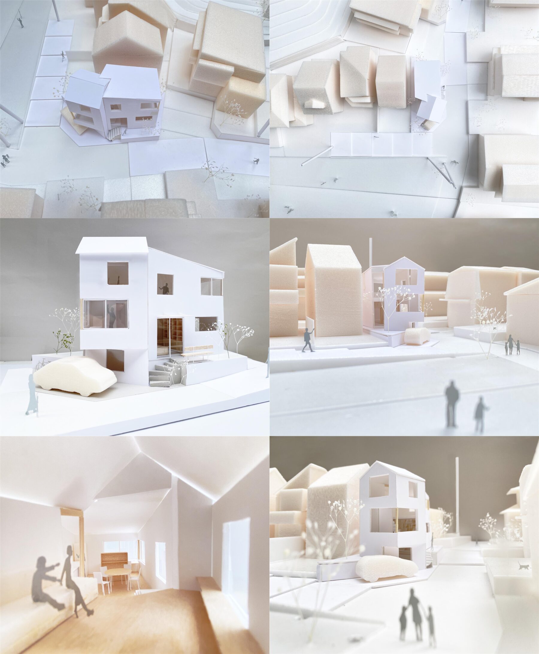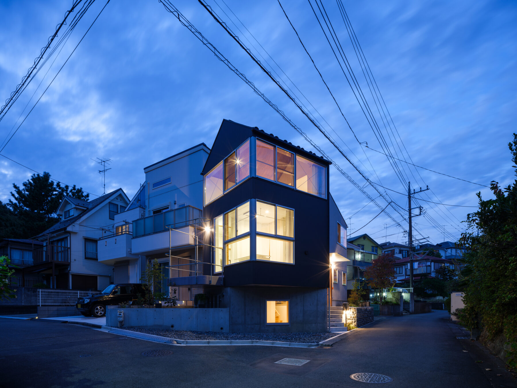 櫓は洞窟・サンルーム・物見台のような性質の異なる3つの小さな空間を重ね、環境をダイレクトに取り込みます。夜に明りが灯ると緑地や散歩道を照らす行燈のようになります。もう一つのヴォリュームは暮らしの中心となる空間とし、蛇行する道や周辺住宅地の庭に向かって開いています。2つのヴォリュームでレベルや開口をずらすことで、「の」の字を描くように5つのフロアが連なり、住宅内部に新しい風景が展開します。