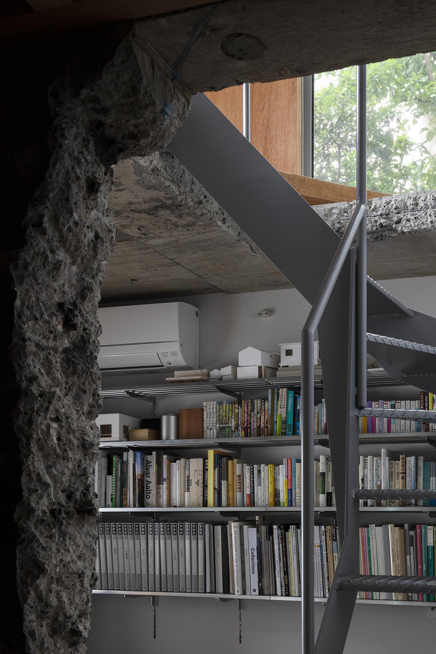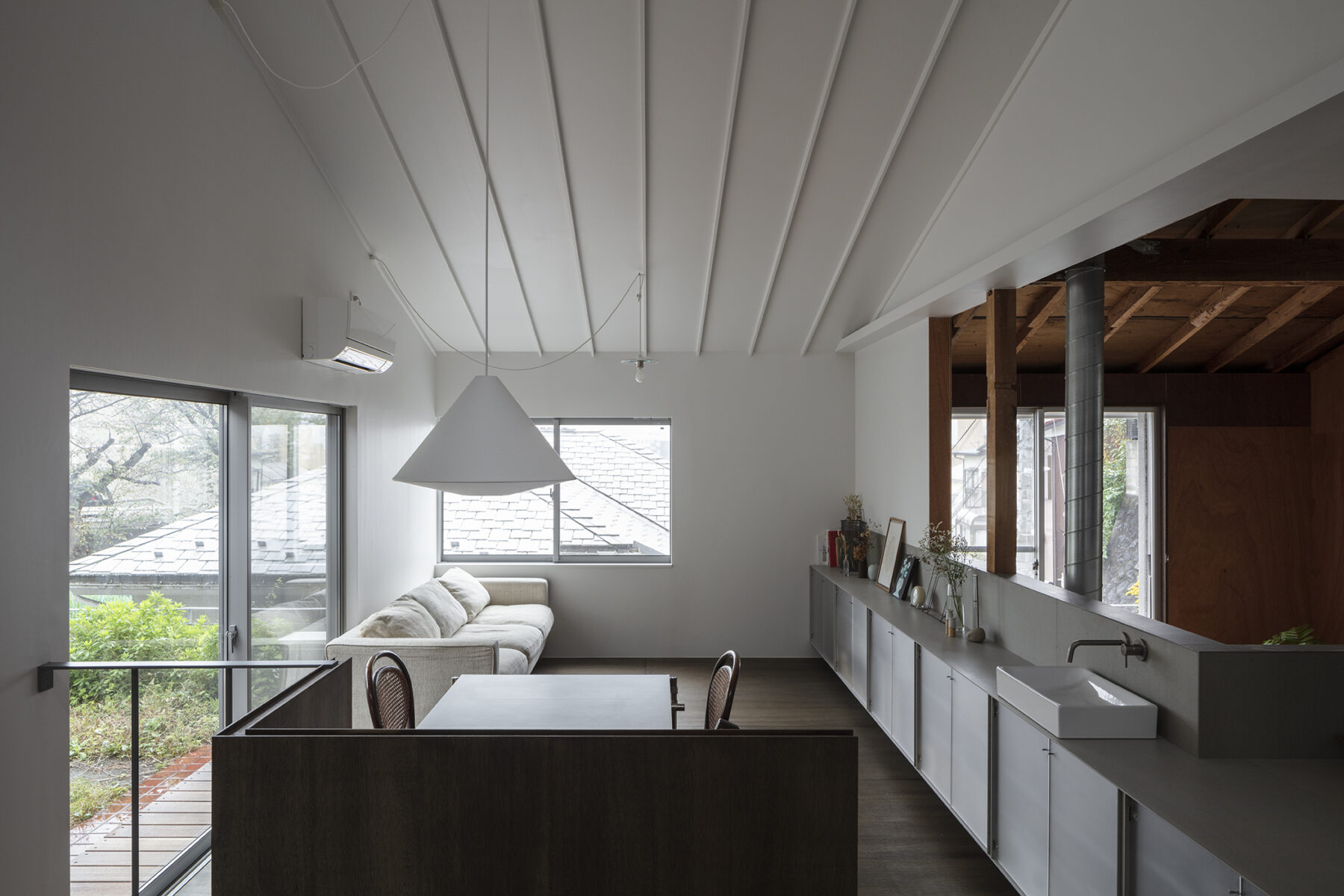多摩丘陵地帯の傾斜地に建つ築45年の戸建て住宅の改修計画。既存建物が持っていた空間的魅力を最大化しながら、家族4人のための住空間と設計者自身のアトリエを併設するための整備を行った。室の配置と形状はそのままに、空間の境界に手を加えることで繋がり方を編集し、ひいては家全体を再定義することを試みた。